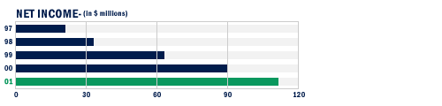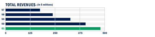 ACMECorp...A LEADER IN SOLUTION SERVICESOverviewWith worldwide headquarters in Cambridge, Massachusetts, ACMECorp and its wholly-owned subsidiaries provide solutions to more than 265 businesses in more than 40 countries. ACMECorp is a leader in its field, and ACME's unique combination of proven and future-ready solutions, delivered in both outsourced and licensed formats, empowers its clients to deliver unparalleled service, improve operational efficiencies and rapidly bring new revenue-generating products to market. ACMECorp is a listed NASDAQ company. 2001 in reviewIn 2001, ACMECorp's revenues increased 20% to $476.9 million. We saw continued increases in both our processing and software operations as a result of new contracts and expanded relationships with existing customers. Processing and related services grew 15% to $339.3 million. Solutions and professional services grew 32% to $137.6 million as a result of continued penetration of our ancillary products and services, including our customer relationship management, self-care, call center and workforce applications. In 2001, ACMECorp: