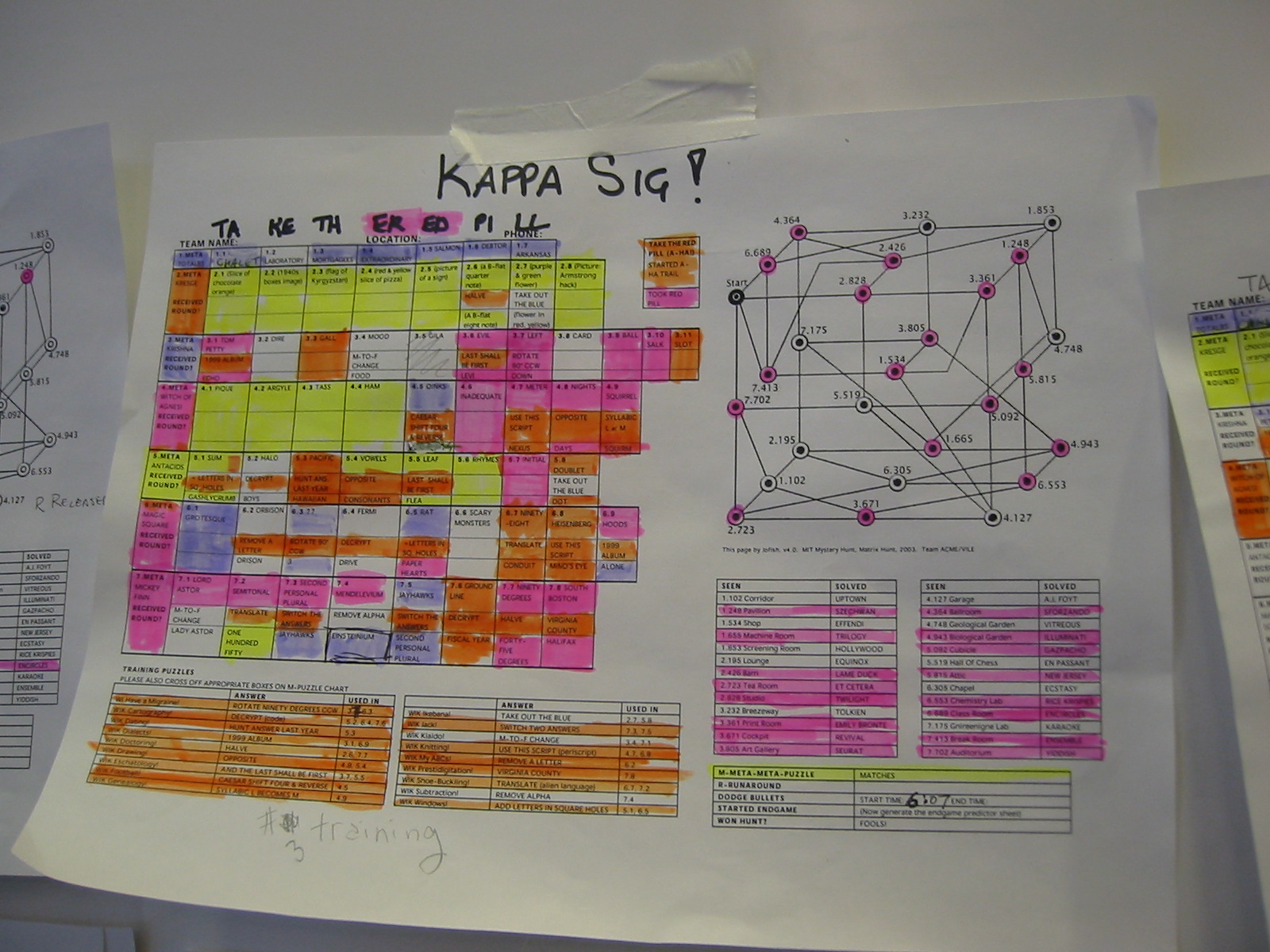 The runaround was designed to reward teams for solving large numbers of the R and M puzzles, since if you'd backsolved metapuzzles to get to this point, there would be the chance that you'd get to a point in the runaround where you hadn't solved *either* of the two prompted puzzle choices, and would have to go back and solve one or the other of them before you could continue the runaround. Luckily for the lead team, Kappa Sig, this fate didn't befall them.