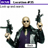 At Vest's office door, ACME greets the team and tells them, "You are ready to find the disc containing the core data of the Matrix. Controlling this disc controls the Matrix. If you'll jack in, we'll upload the map you need with this useful hand-held trainer--" taking out a Palm Pilot.