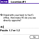 The final runaround is a Palm Pilot application. You can download it onto a palm pilot, if you have one, or run the program on a desktop machine using a Palm OS Emulator, like we did at the wrap-up. Source code is also available, if you're interested.