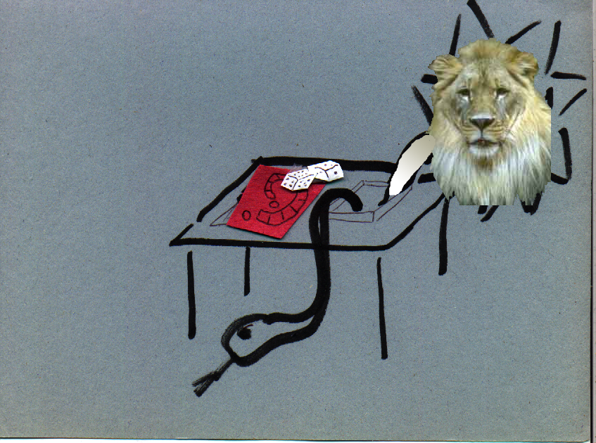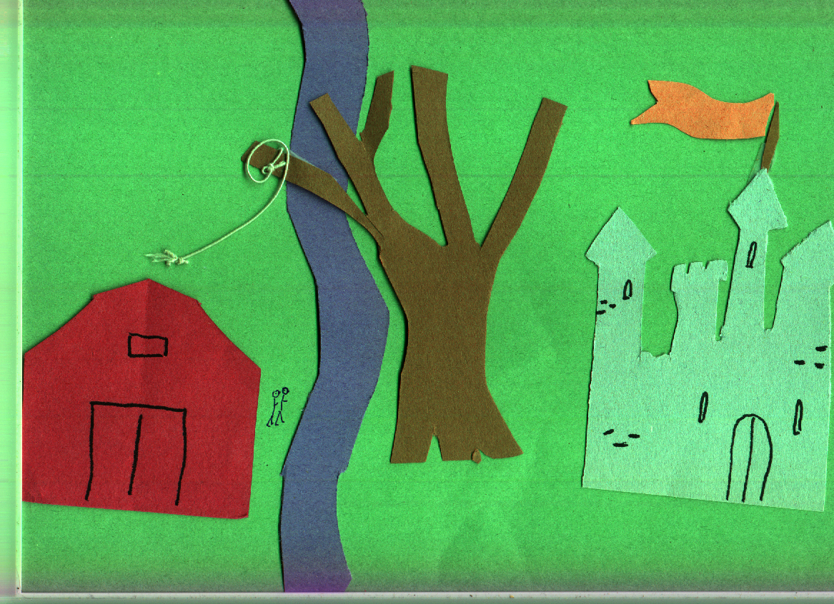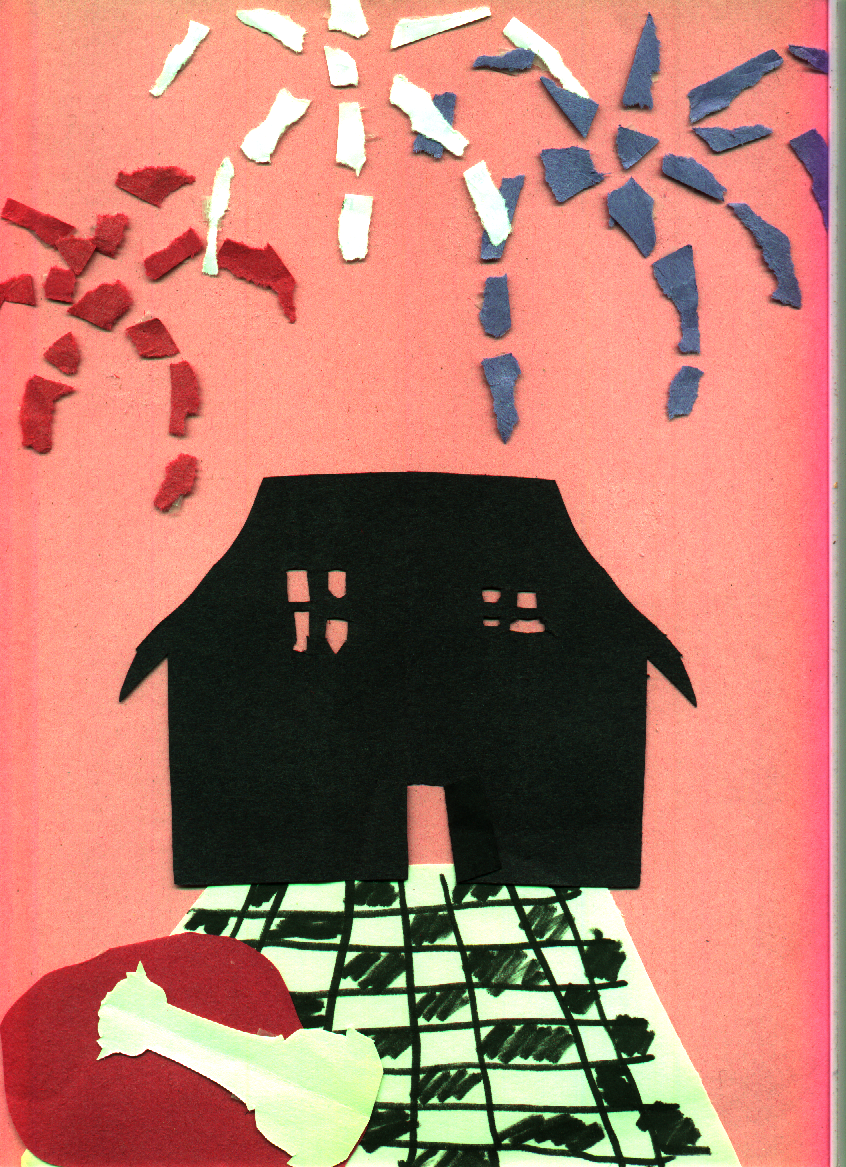 This is a manila folder containing a number of pictures. Most of them seem to be either glue-sticked together, drawn with magic marker, or both.