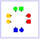 When drawing square dance figures, it is traditional to specify men as squares and women as circles, with small protuberances denoting the front of the body. When the Unnamed Facility club draws square dancing figures, couple 1 is blue, couple 2 is red, couple 3 is green and couple 4 is yellow.